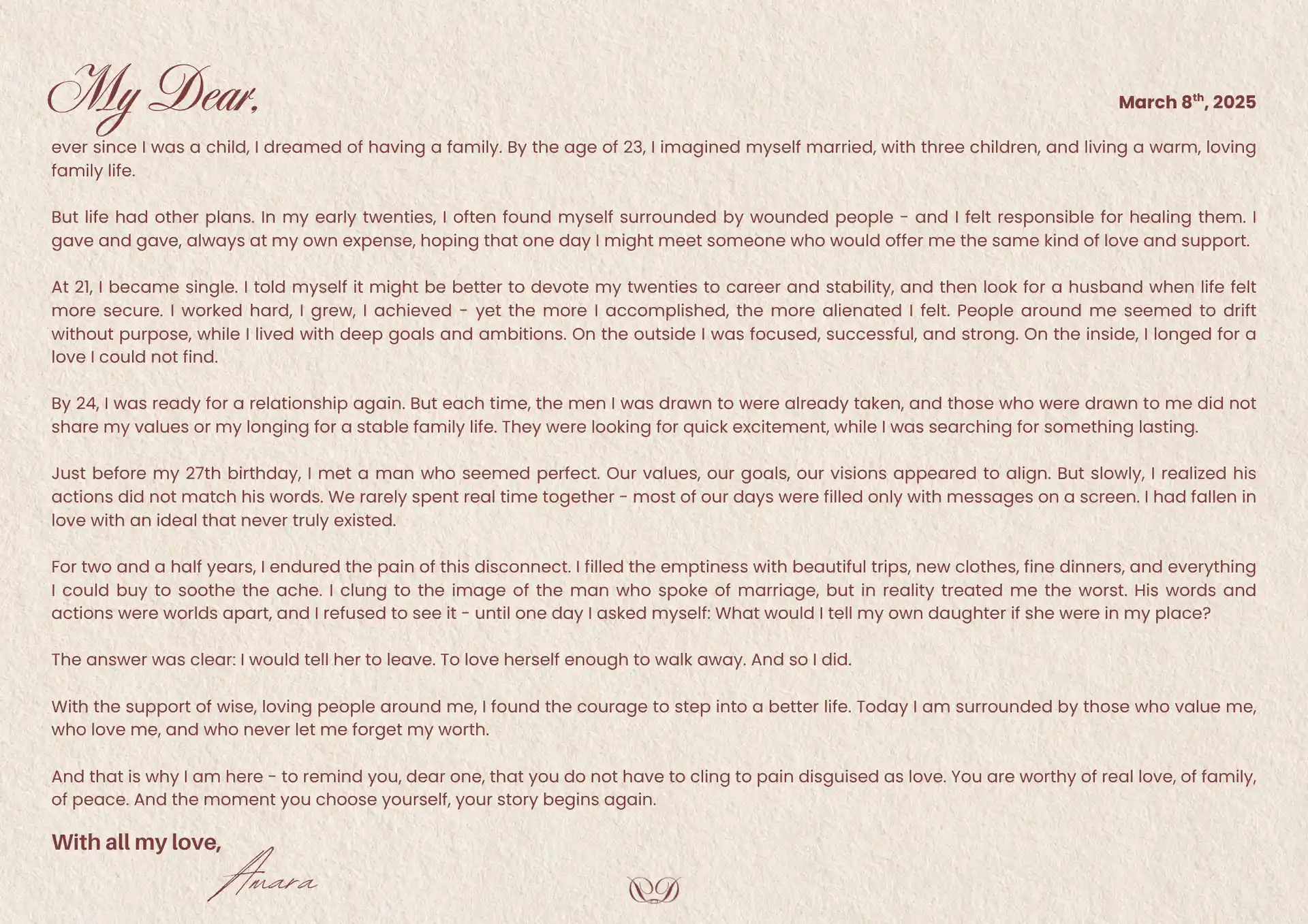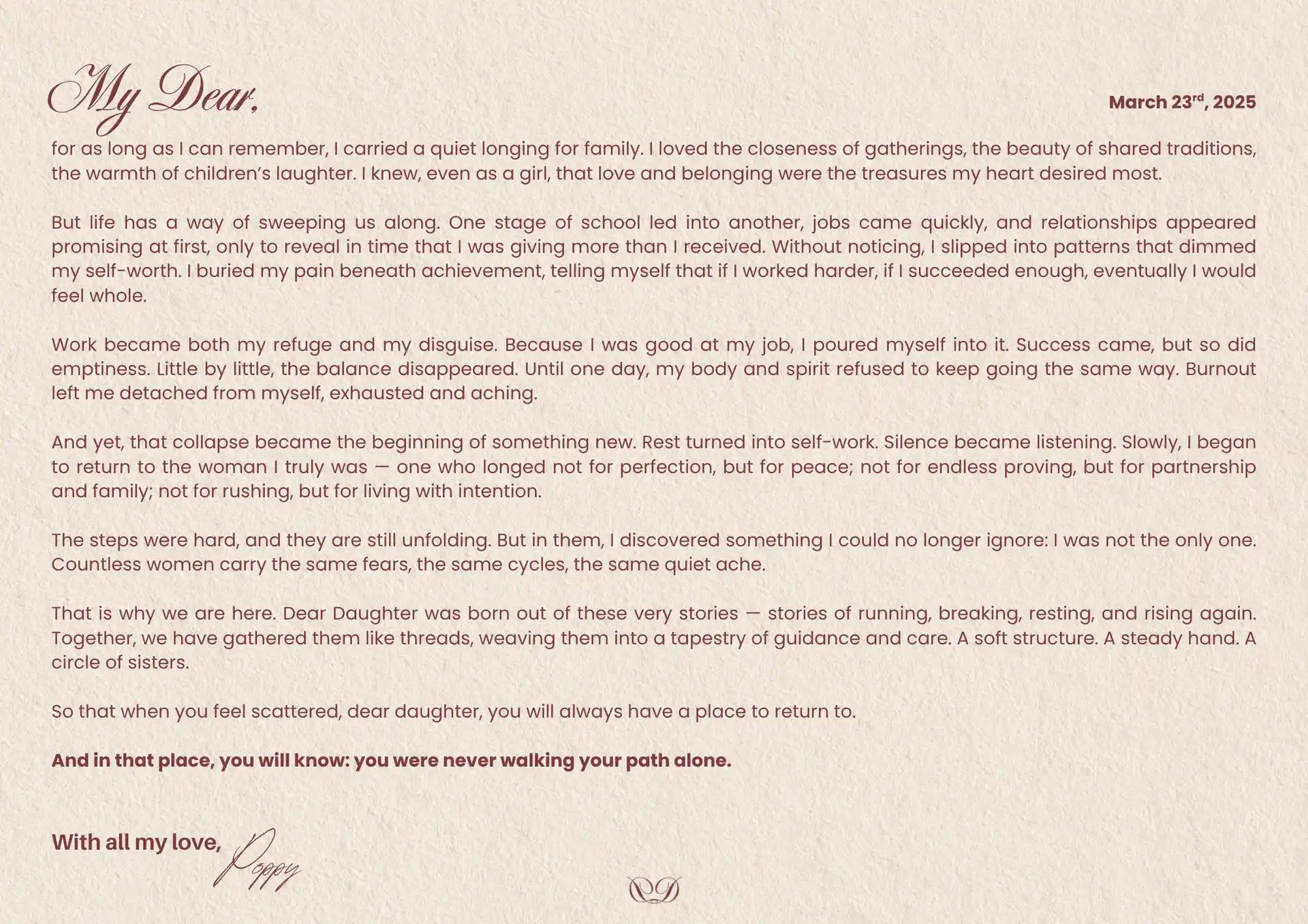 You’re not starting over. You’re simply turning toward something deeper. Dear Daughter isn’t about perfection. It’s about beingreal with yourself, again and again, as you walk this path.